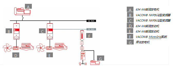 推進器和發動機係統:2台推進器,每台采用2台三菱634 kW柴油發動機 + 兩台由2個VACON® NXP水冷型變頻器控製的285 kW Baumüller電動力矩電機。