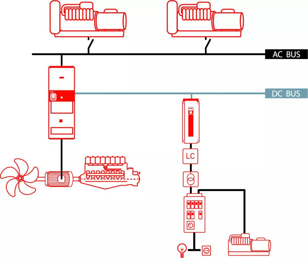 在傳統的直接驅動配置中,柴油引擎和推進器之間有一個機械連接。所以,推進器速度與引擎速度成正比。也就是說,很多情況下引擎並非在最佳作業條件下運行。通過柴油電力混合驅動可以大大減少這種低效率運行,因為發電機和推進器之間存在電力轉換。電力轉換使得推進器的速度和變槳能夠得到優化,與機械轉換相比大幅提高了效率。