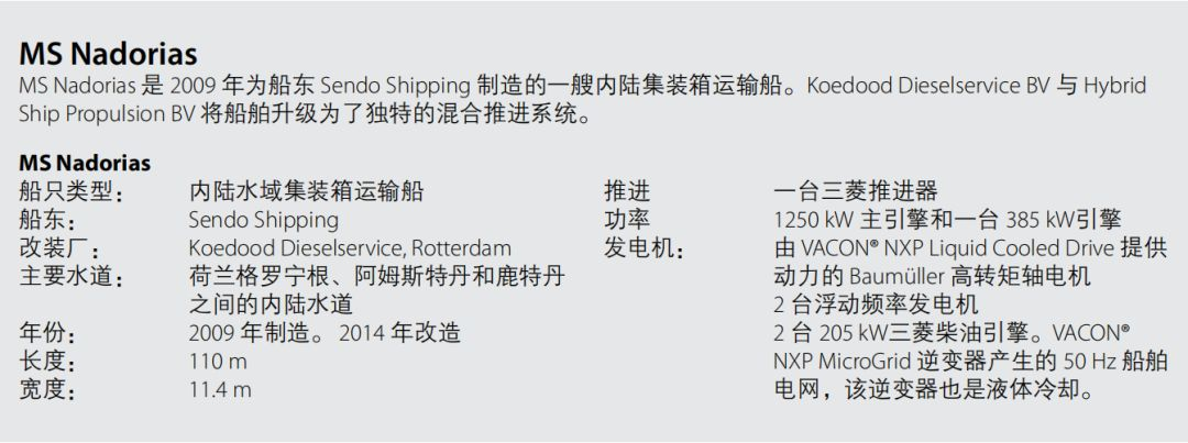 船舶MS Nadorias於2014年進行了改造,現在由HSP的柴油電動混合推進係統提供動力,該係統使用的是丹佛斯VACON® NXP Liquid Cooled Drive。