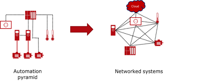 圖1:工業4.0意味著從自動化金字塔向網絡化係統的過渡
