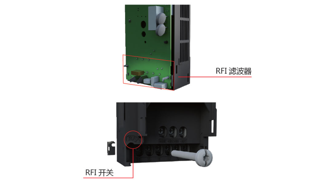 全係內置C3等級的RFI濾波器(可通過RFI開關選擇是否連接),可以減小電磁幹擾,使變頻器EMC性能達到二類環境(工業環境)不受限製使用。