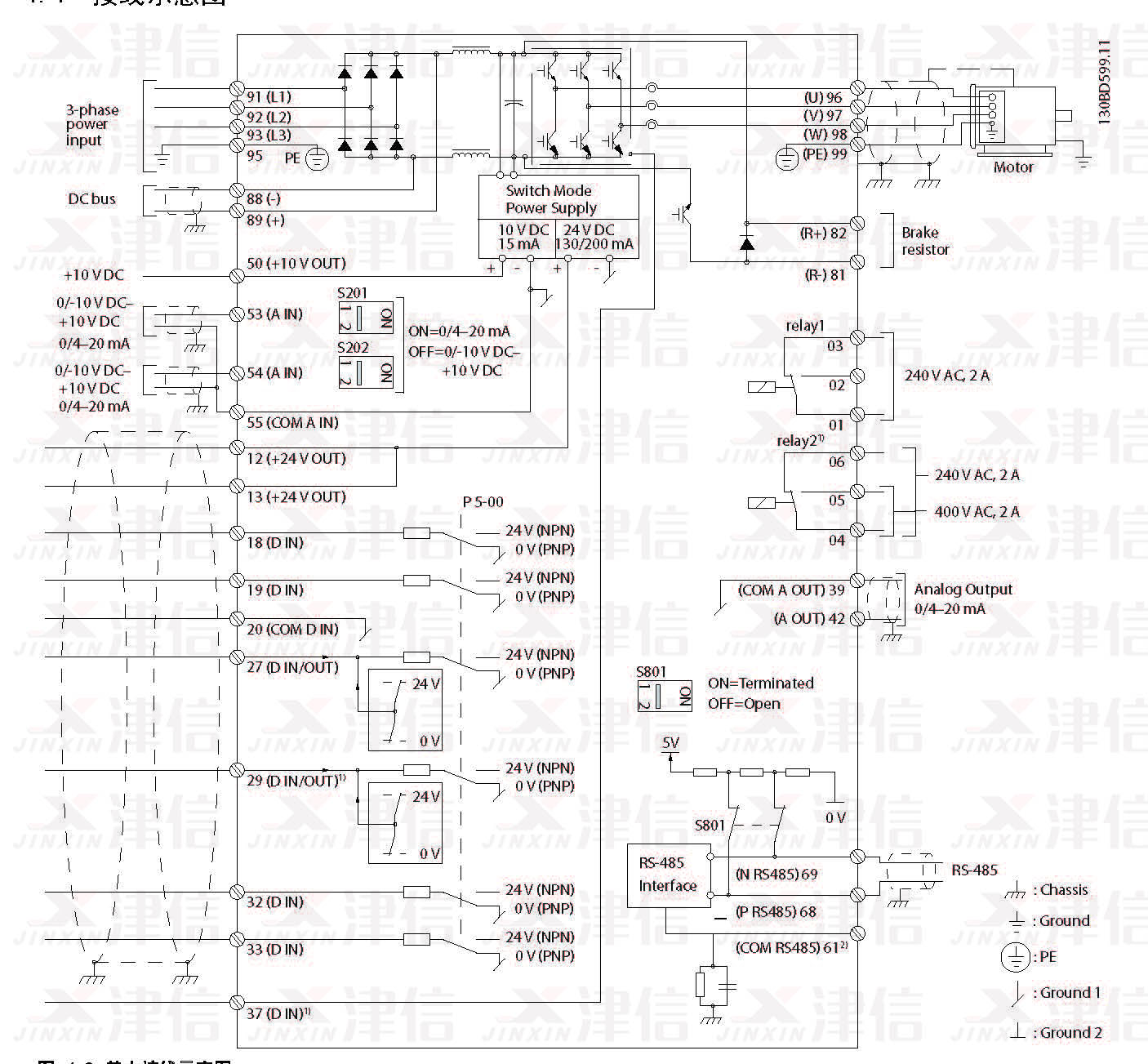 1) 內置製動斬波器僅在 3 相設備上可用。