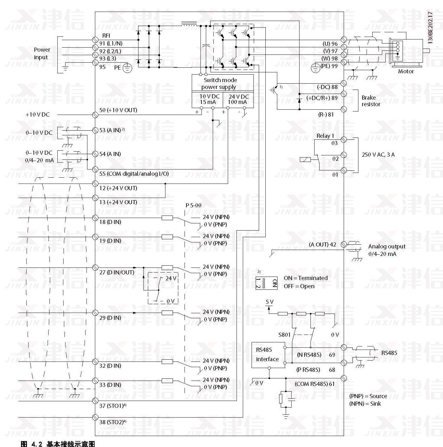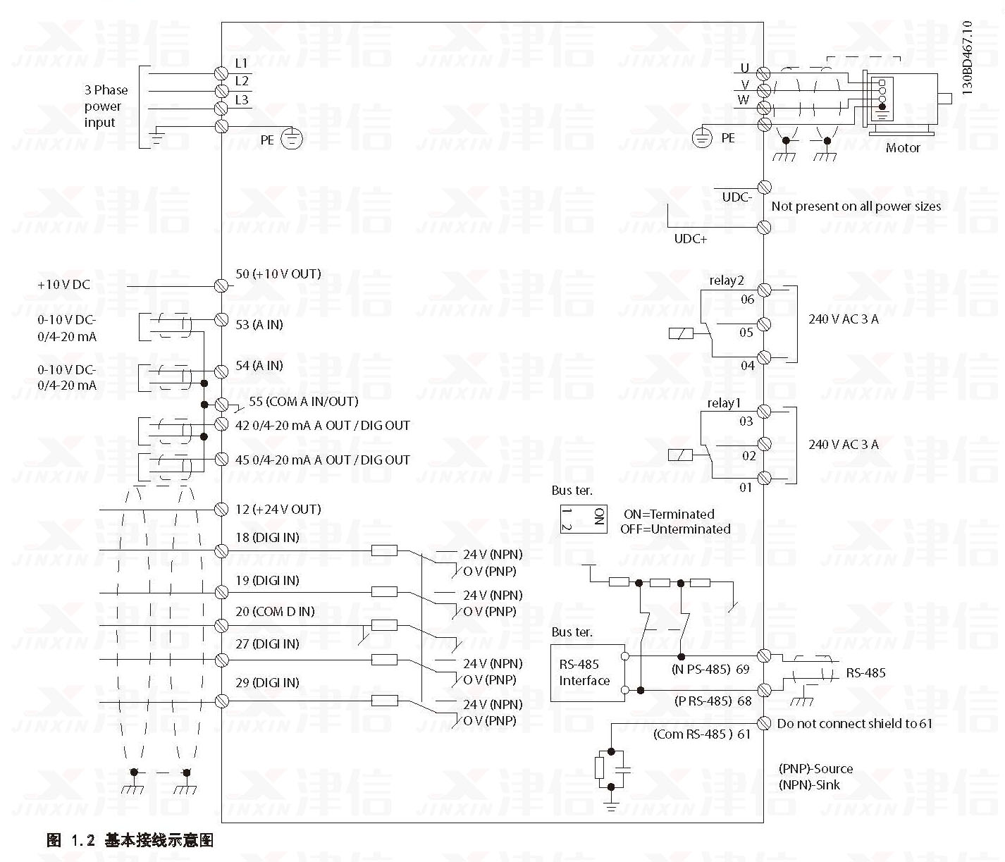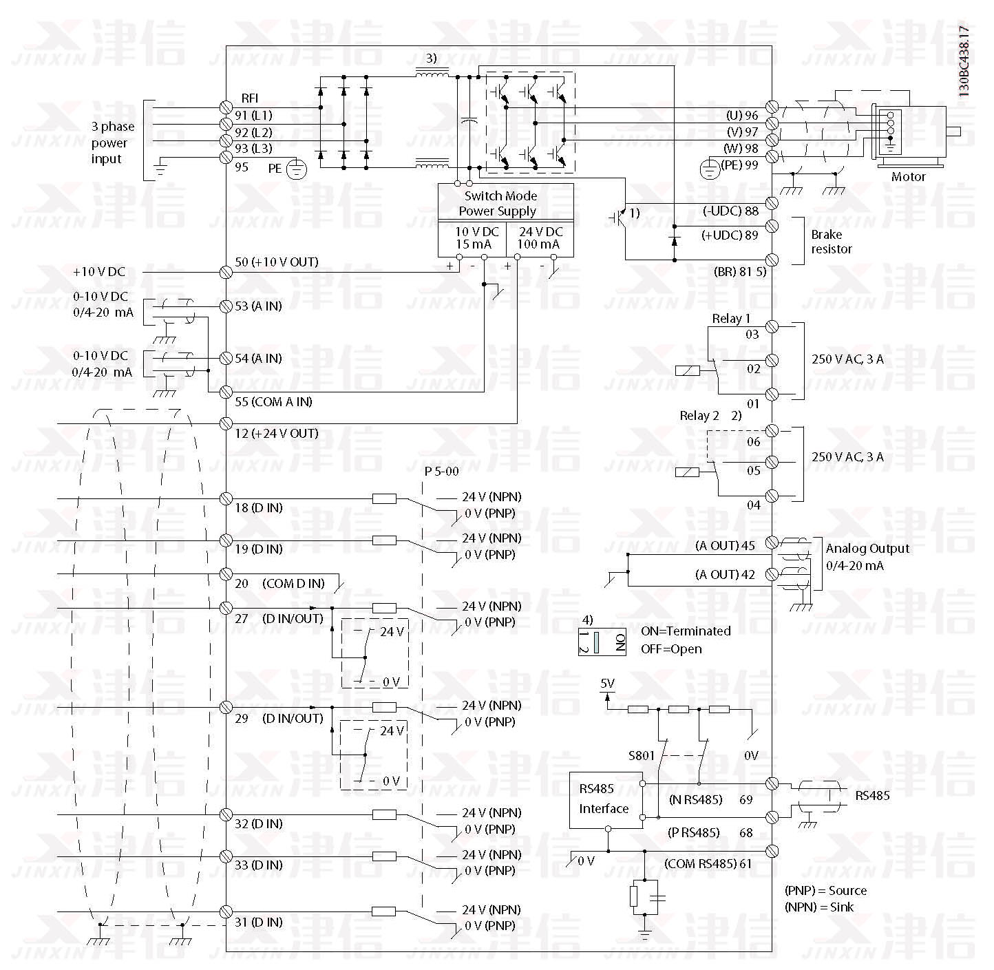 成人午夜在线观看采用交-直-交工作原理,先將三相交流電經整流部分變換成直流,經濾波後通過IGBT或其它電力電子器件逆變成頻率和電壓均可變的三相交流電供電機使用。變頻器的基本構成由主電路(包括整流器、中間直流環節、逆變器)和控製電路組成,以下是丹佛斯各係列變頻器的接線示意圖。