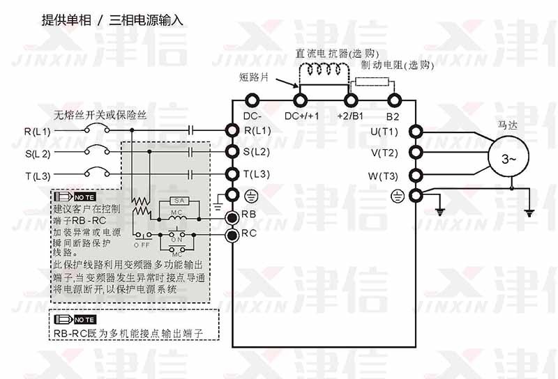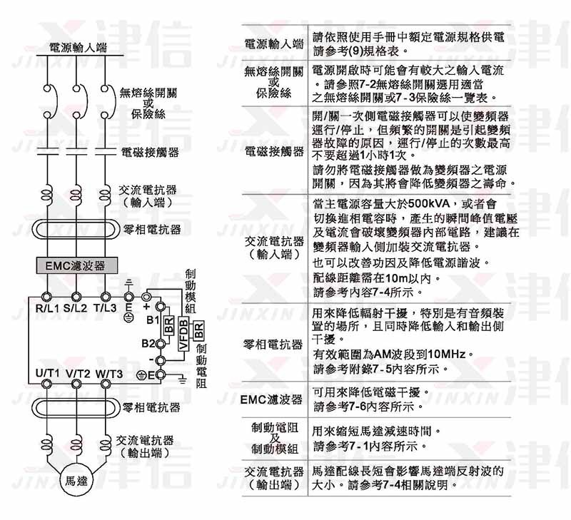 變頻器的主回路電源端子 R/L1、S/L2、T/L3 是輸入電源端。如果將電源錯 誤連接於真E端子,則將損壞變頻器。另外應確認電源應在銘牌標示的允許
