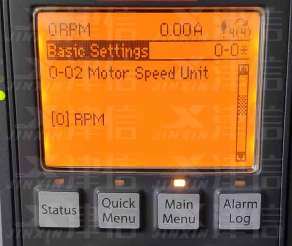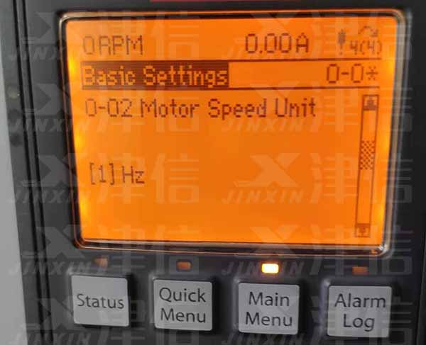 選擇0-02,選擇電機速度單位,默認為選項[0]:RPM,[1]為Hz
