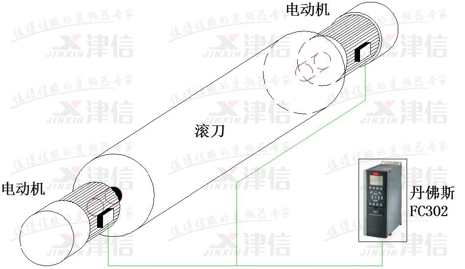 丹佛斯FC302變頻器通過磁通矢量控製同時驅動兩台異步伺服電機,保證在飛剪同步的過程中滾刀兩電機輸出轉速和轉矩一致。在選型和調試時隻要將電機的功率和電機的電流相加即可,這樣就可以隻通過丹佛斯FC302變頻器來實現剛性連接的兩個電機同步。