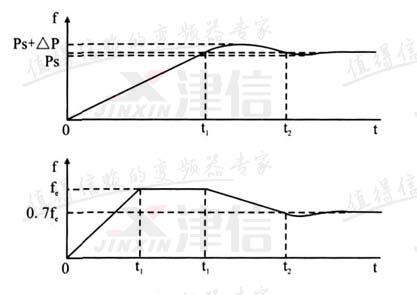 時(t1),空壓機輸出頻率開始下降,由於慣性壓力還會有一點超調量Δ