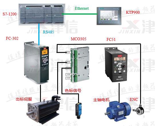 PLC與觸摸屏之間進行Ethernet通訊,PLC與丹佛斯FC302變頻器之間進行RS485通信,通過觸摸屏可以設置標長、對標位置、出標起始位置等工藝參數;FC302變頻器控製出標伺服電機,以保證出標精度及響應精度。