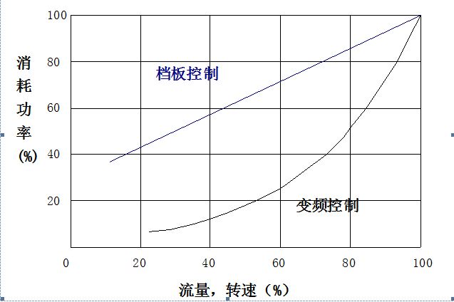 交流驅動係統實際使用時,可通過實測或根據其靜態特性的理論計算,作出其轉速對功率的特性曲線,由於轉速與流量成正比,該曲線即流量對功率的特性,如圖1所示。與檔板調節相比較,可見其節能是顯著的。