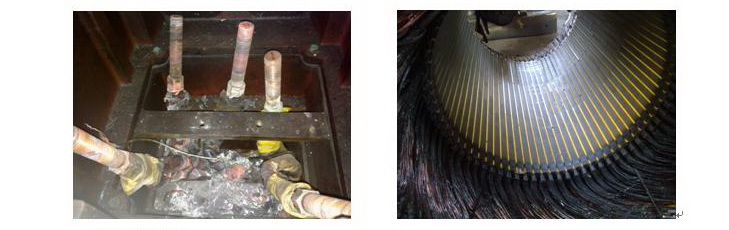 電機檢查:將電機的接線盒打開後發現,電機的接線柱子已近完全燒壞。後將電機全部拆開發現內部繞組完全燒毀。見下圖: