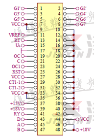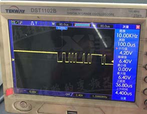 給變頻器送電後,變頻器麵板顯示ERR37,根據故障解釋說明,檢查CPU小板反饋至控製卡的信號波形異常,有帶毛刺的尖雜波。測量點為下圖45,47號。