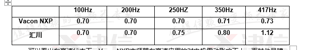 可以看出在高速狀態下,VaconNXP變頻器在高速應用的對電機震動影響不大,而其他品牌變頻器在高速應用時,會增加電機震動。高速應用在Vacon變頻器有完整的解決方案,NXP係列變頻器完全可以穩定應用在高速應用的場合,同時有良好的應用效果。