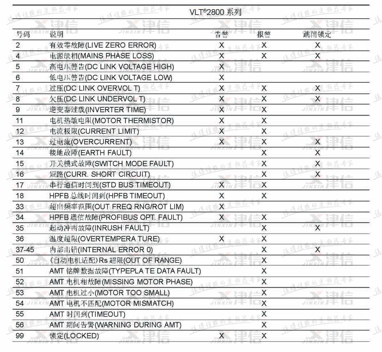 丹佛斯VLT2800係列變頻器故障代碼和報警信息如下: