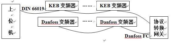 為了節省投資,變頻器替換采取逐步進行方式,即損壞一台KEB變頻器,替換一台。也就是說係統中將同時存在兩種變頻器和兩種協議。現在要開發的通訊協議轉換網關就是要使其對上位機而言,丹佛斯依然被視作DIN 66019協議的數據設備;而對於Danfoss變頻器而言,還是在Danfoss FC協議控製下工作。此外,根據功能需求分析,該協議轉換網關需要具有伸縮性,即增加Danfoss變頻器時,需要將新增加的Danfoss變頻器包裝成DIN 66019協議下的設備,而不管成人午夜在线观看的數量多少,在上位機看來,它們應該是DIN 66019協議下的與原KEB變頻器沒有任何衝突的設備。兩種協議並存的結構框圖如圖2所示。