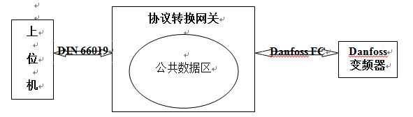 為了實現高效的通訊應答控製,同時為了使程序結構簡明、清晰,協議轉換程序采用多線程結構。在存儲器中開辟出一塊公共數據區,用於兩個相對獨立的通訊線程的數據存取與共享。線程1為上位機與網關之間的通訊線程,采用DIN66019協議,當上位機發指令時,線程1將上位機的指令存入公共數據區,然後應答上位機;當上位機讀取數據時,線程1立即將公共數據區內的相關數據發送回上位機。另一個線程為網關與Danfoss變頻器之間的通訊線程,采用Danfoss FC協議,網關從公共數據區取得來自上位機的指令,轉為FC協議數據發送至Danfoss變頻器,Danfoss變頻器在收到指令之後應答網關;空閑時網關連續讀取變頻器的狀態和運行數據刷新公共數據區。結構框圖如圖4所示。