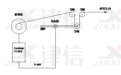 如圖中所示;設備主要包含導輪支架,0-10V電位器,收卷電機,丹佛斯FC360變頻器。FC360根據擺杆位置反饋控製放卷電機的轉速快慢和方向正反,使得放線速度和牽引速度保持同步,並使得擺杆在某個位置穩定,放線速度穩定恒速。