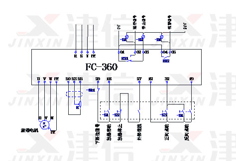 此應用事例中,放線架配置了升降台,用於裝載和卸下放卷盤,升降台隻允許在放卷停機時進行操作。為避免在運行過程中誤操作升降台,使用FC360的繼電器2在運行時輸出一個信號給控製升降台回路中的繼電器,放卷運行時斷開升降控製回路,從而保證升降機不被啟動。