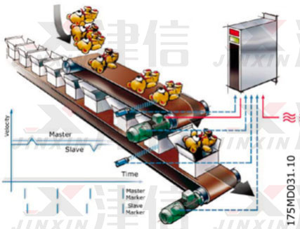 丹佛斯同步卡的標記位置同步功能基於精確的角度同步控製,並且能根據外部標記信號修正相位偏差。標記同步控製廣泛應用於生產行業。係統的核心控製邏輯是在檢測到主軸產品與從軸產品以後,調速,補償他們之間的相位差,然後令兩條生產線保持位移同步。