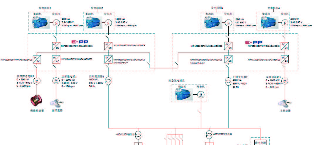 該船的直流電推係統的核心部件變頻器采用了VACON水冷共直流母線變頻產品。VACON變頻器是全球最早用於船舶直流組網電推係統的變頻產品,業績眾多並積累了豐富的經驗。用於直流電推的變頻器硬件結構都為直流-交流IGBT功率轉換裝置,根據不同的應用加裝不同的應用宏。該船發電機采用異步發電機,用於連接發電機到直流母排的整流器加裝發電機應用宏,發電機的電壓和頻率範圍都可調節並且範圍寬廣,完美實現變速發電機組的根據實際負荷變化的運行要求。整流器前端無需前置LCL或者正弦波濾波器,節省體積與成本。用於主推進和側推的逆變器加裝船舶應用宏,可以精確的控製推進器並且具有恒功率控製,轉矩限製等功能。用於電源的2個逆變器加裝並網變流器應用宏,後端加正弦波濾波器和隔離變壓器組成變頻電源可以給全船其他負載提供純淨的交流電。並且可以和應急發電機組並聯運行。