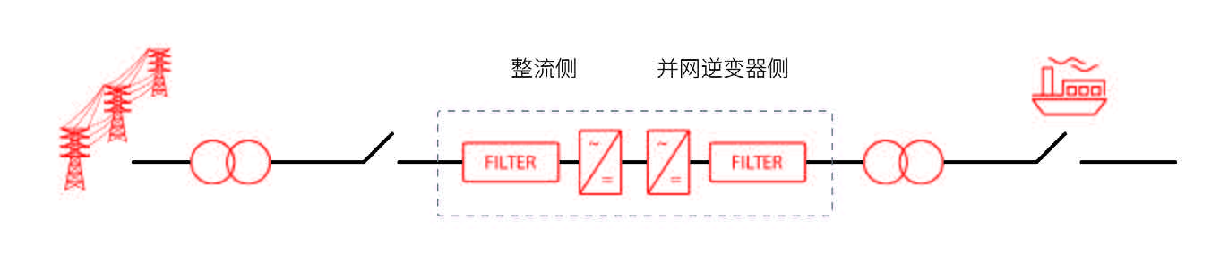 丹佛斯岸電電源係統通常包含岸側整流裝置和船側並網變流器裝置,如下圖所示: