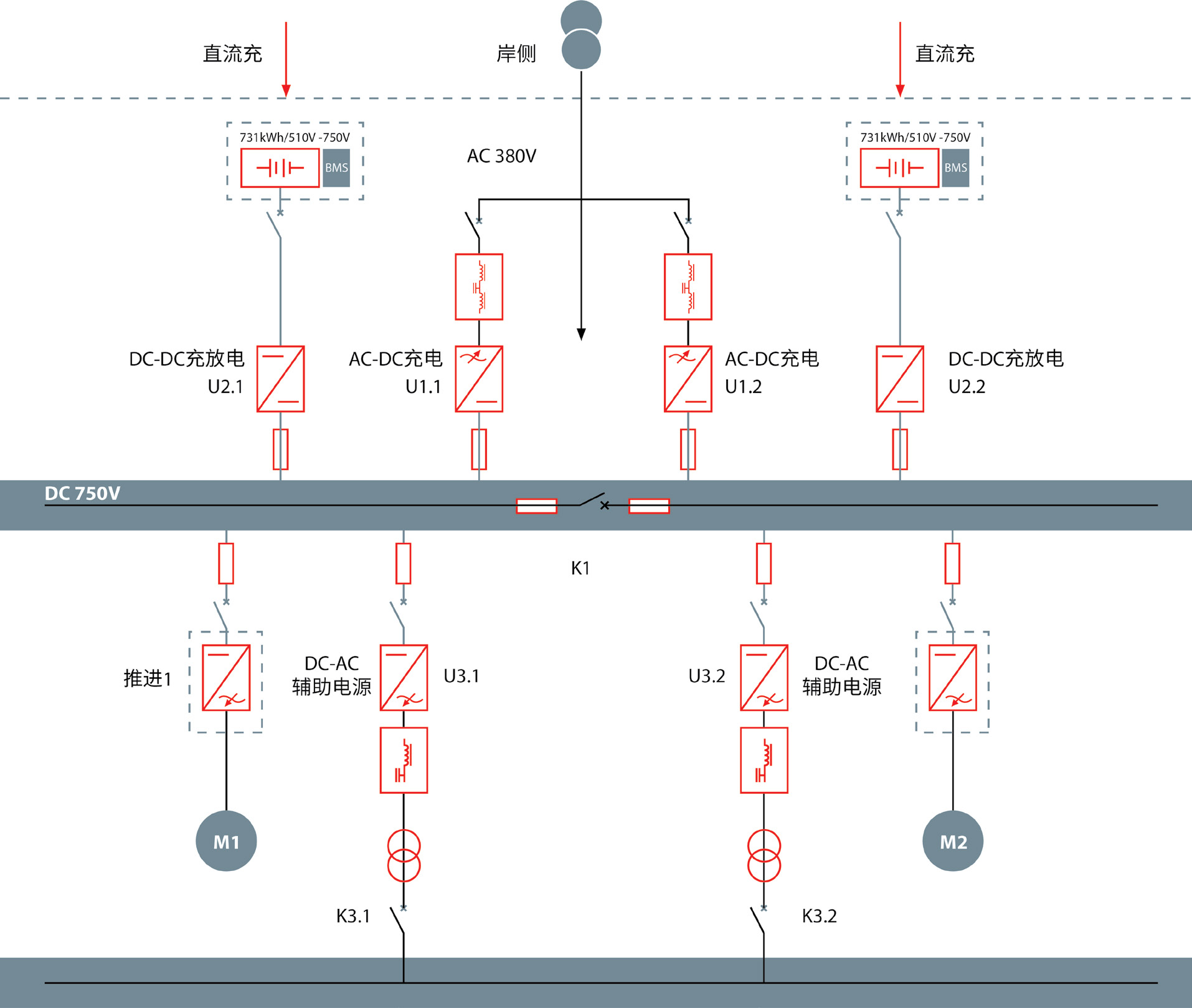 船舶航行時,可通過NXP係列中的DC/DC變流器控製電池進行放電維持直流電網,此時推進係統通過逆變器來控製推進電機的運行,通過輔助電源逆變器,來為船上其它用電設施供電,保證整船的順利運行;船舶在減速製動時,通過DC/DC 變流器的充電功能將製動能量回饋至電池,實現能量循環利用;在船舶靠岸時,通過采用交流充電裝置或直流充電裝置來對電池進行充電。