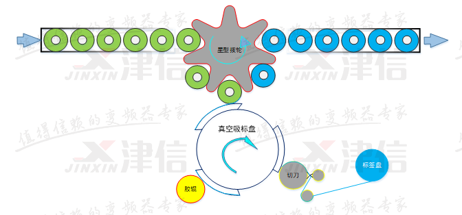如圖中所示;設備采用了真空旋轉式標盤,具有吸標、傳輸、貼標等多方麵功能,同時塗膠輥與切刀輥負責標簽的切斷與塗膠,並設有‘無瓶不出標’和‘無標不塗膠’功能,提高了貼標效率與工作的可靠性。