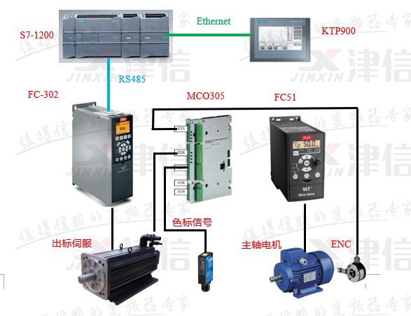 PLC與觸摸屏之間進行Ethernet通訊,PLC與丹佛斯FC302變頻器之間進行RS485通信,通過觸摸屏可以設置標長、對標位置、出標起始位置等工藝參數;FC302變頻器控製出標伺服電機,以保證出標精度及響應精度。