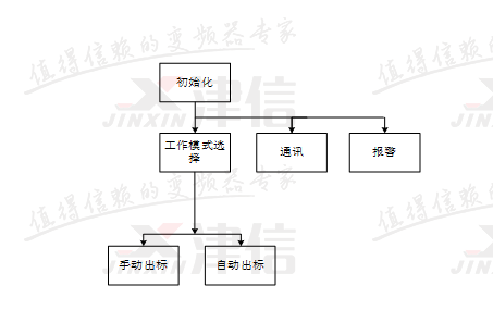 開機後,首先進行程序的初始化。初始化完成後同時調用工作模式選擇、報警和PLC與變頻器之間的通訊程序。工作模式中,包含手動出標、自動出標兩種狀態。報警程序用於對機器狀態進行實時監控,並根據故障情況執行相關動作。