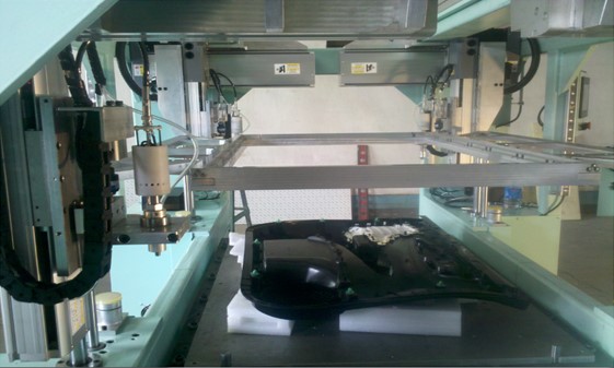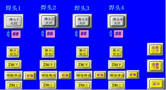 4頭超聲波焊機用於汽車內飾焊接上,有4個獨立的焊頭,每個焊頭上有X、Y、Z三個運動軸。主要有回零、示教、焊點定位、及焊點測試等功能,設有焊頭防撞保護、光柵保護、伺服報警保護,設備暫停等保護功能。設備如圖一所示: