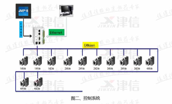 10MC運動控製器的COM2口與DOP-B10E615觸摸屏通過RS485通訊,通過觸摸屏可以設置用戶工藝參數;控製器的CAN端口與A2伺服進行CANopen通訊,通過CAN總線控製伺服的運動及讀取伺服的狀態。