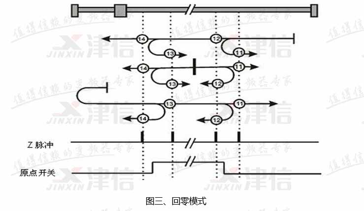 根據客戶要求,選擇的回零方式為:回零時反轉,找到零位信號後,伺服開始正轉,找到第一個Z相脈衝後再偏移一定的原點偏移量,回零方式如圖三所示。